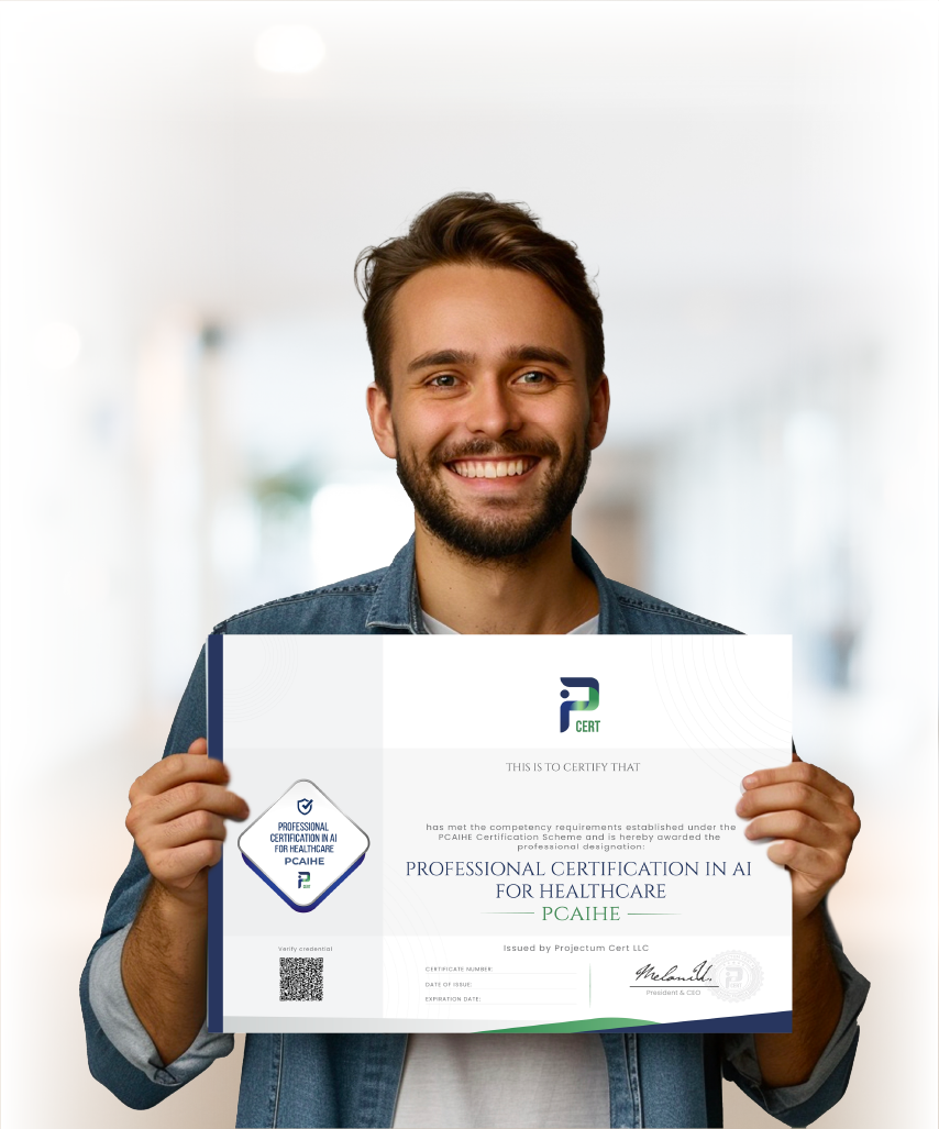 The PCAIHE certification validates your ability to apply artificial intelligence in healthcare environments, improving diagnostics, decision-making, and operational efficiency while ensuring ethical and regulatory compliance.